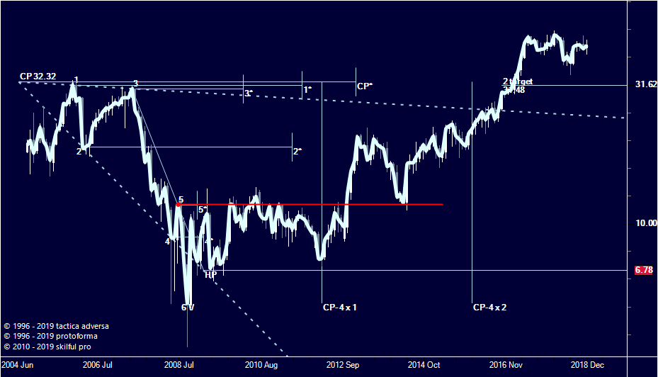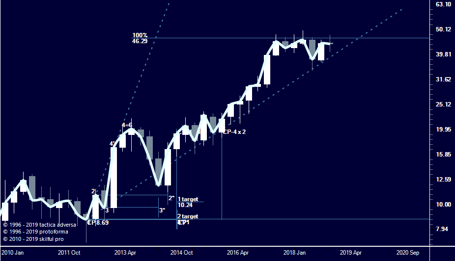 Квартальный план, цену сверху подпирает уровень 100% модели расширения, а диагональной поддержкой выступает линия тренда модели. Ситуация близка к проливу на хаях :