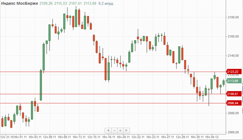 Индекс Мосбиржи на прошедшей торговой сессии закрылся снижением на 0,27% на отметке 2113,69п. В текущей ситуации локальная поддержка по-прежнему расположена на отметке 2100п. и основная на 2090п., проход которой может усилить продажи в район 2080п.-2065п. Для продолжения роста индикатору нужно преодолеть отметку 2123п.