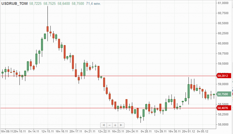 По итогам прошедшей торговой сессии, несмотря на резкие изменения котировок нефти российский рубль продемонстрировал нейтральную динамику закрывшись на отметке 58,75. В настоящий момент локальным сопротивлением в паре доллар-рубль является отметка 59,20, поддержкой выступает 58,40.