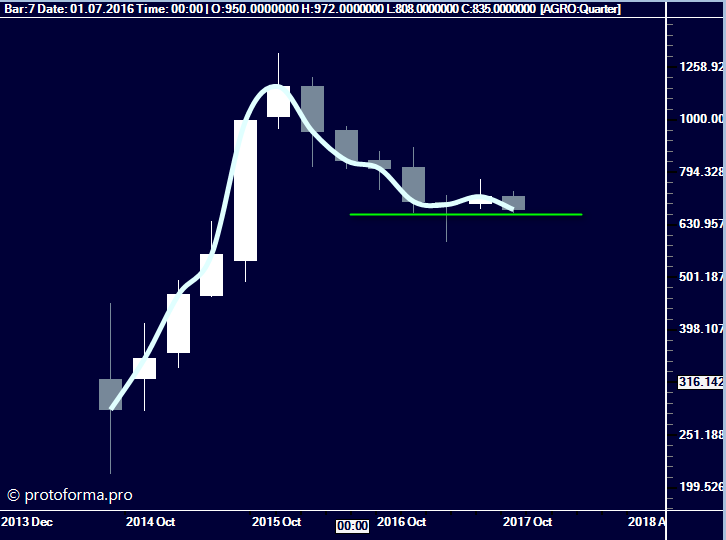 На квартальном графике цена корректируется и вероятно формирует базу: