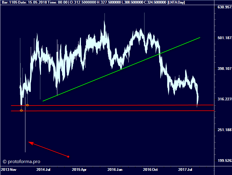 Лента долго и вяло торговалась в восходящем тренде и «пролилась» даун движением достаточно мощно. Сейчас цена в зоне уровней которые были ранее проторгованы, за ними только выброс тени и в случае пробоя последнего бастиона движение вниз продолжится: