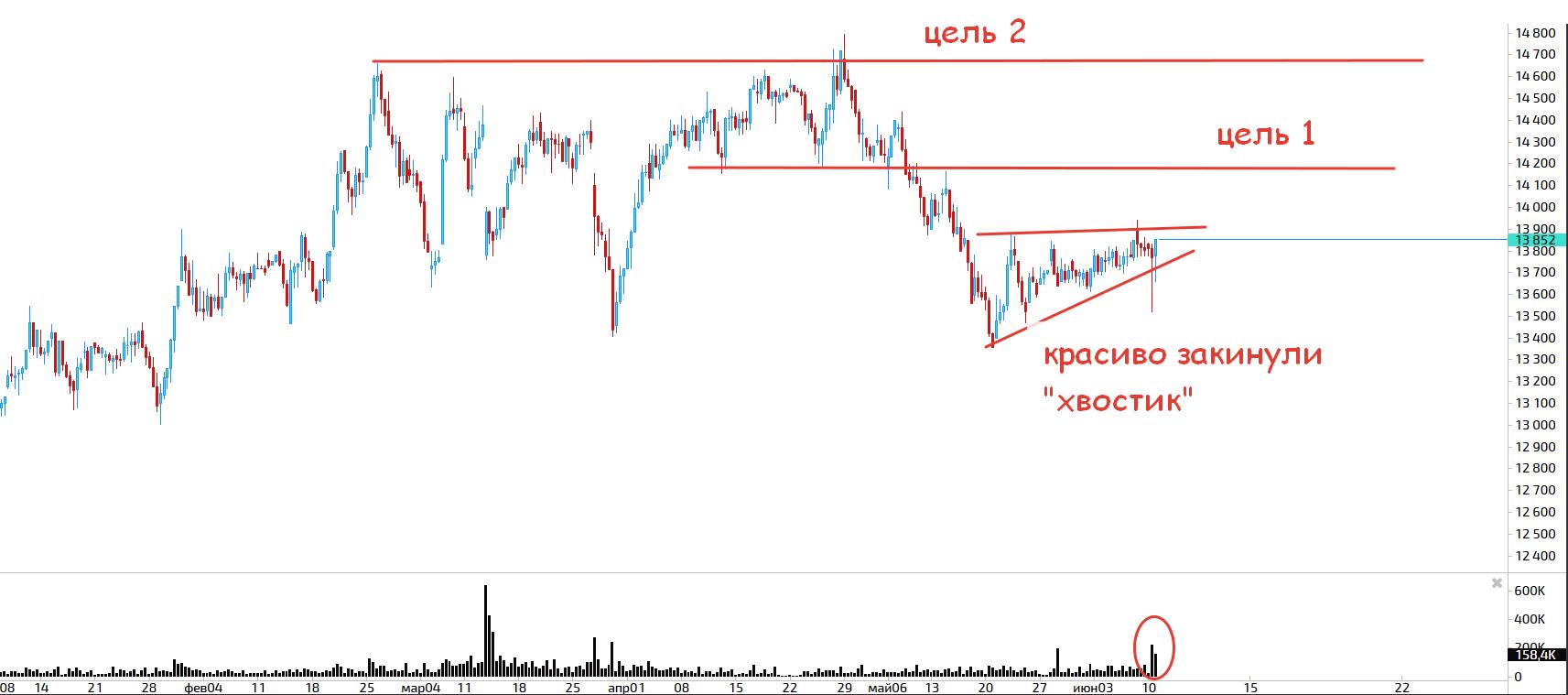 Первая любопытная ситуация образовалась на акции «ГМК Норникель», тут мы видим многодневное удержание цены на поддержке с красивым ложным пробоем треугольника вниз: