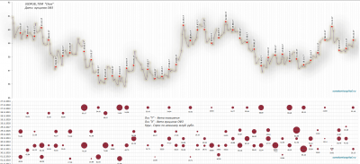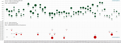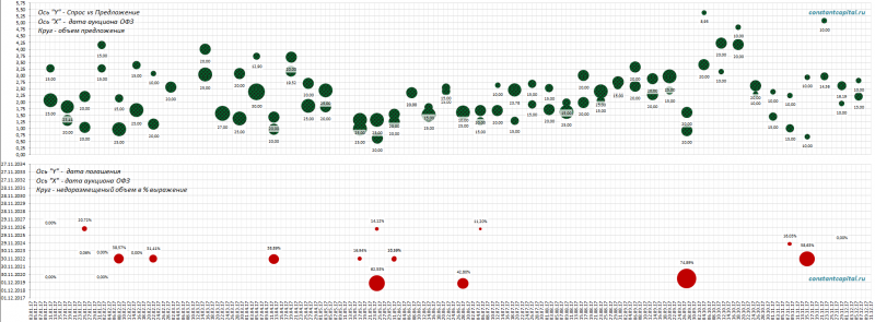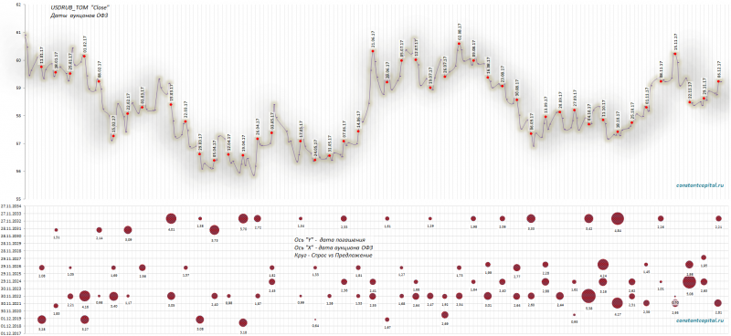 График размещений ОФЗ (по параметрам — дата погашения; спрос при размещение) в соотношение с графиком #USDRUB за 2017 г., объемы так же понижены.