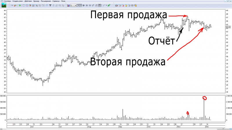 Но как знает любой здравомыслящий трейдер, верить никому нельзя. Открываем график и смотрим, что происходит на рынке. Выходит отчет за 3 квартал 2017 года. Рынок идет вверх, но тут начинаются первые продажи. Вроде бы пока ничего страшного нет. Но 30 ноября происходит вторая волна продаж, и объем ее просто колоссальный. Торговый оборот за этот день самый большой за все время присутствия ММК на бирже!!!