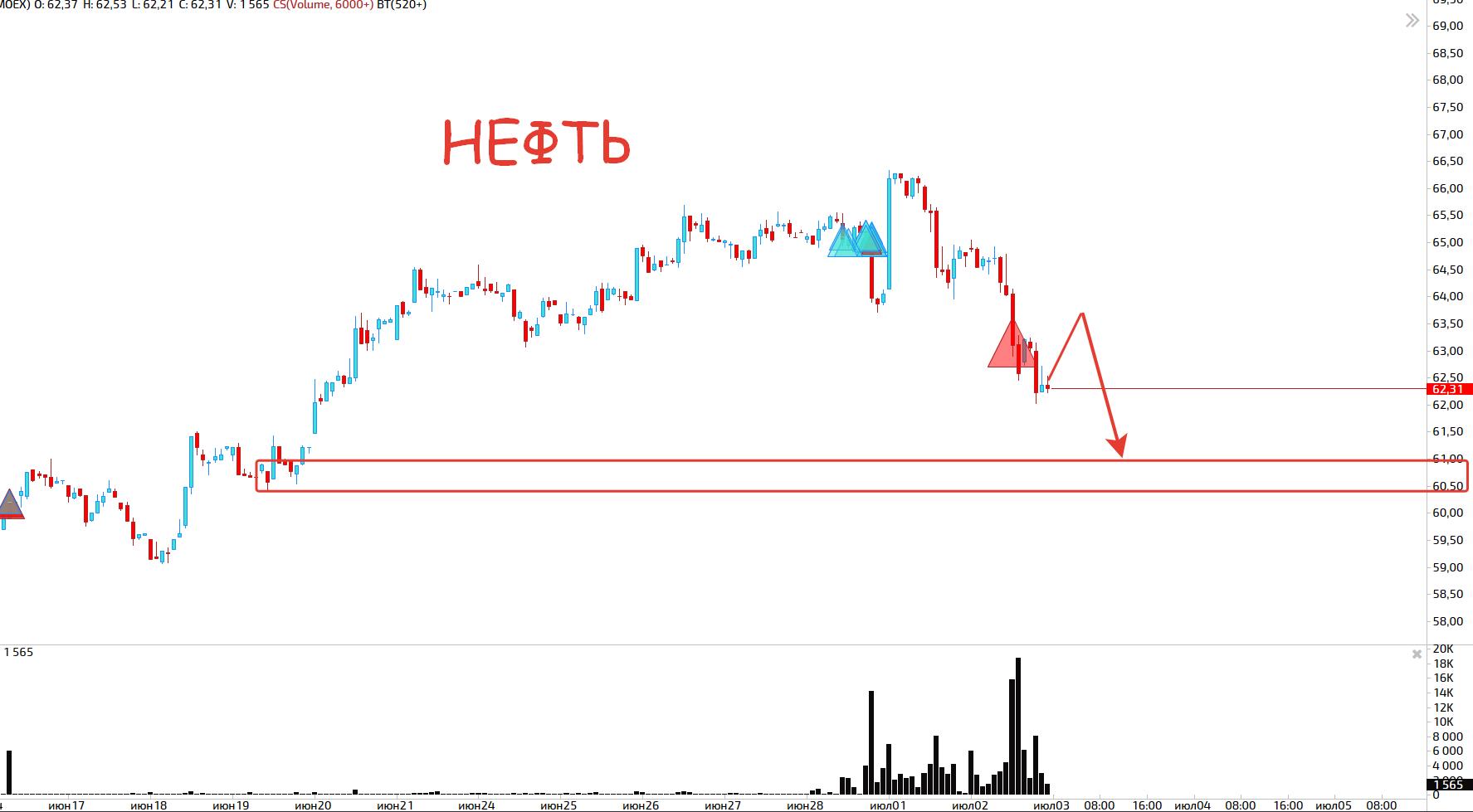 Всем доброго утра! Что у нас на горизонте? Нефть падлюка скинула меня с вагона, а сама приехала на отмеченную станцию 62.5 (по брент на Московской бирже с учетом смены контракта), а я остался с носом и теперь сижу думаю, стоит ли попытаться запрыгнуть обратно дабы проехать еще одну остановку! Тест уровня 63.5-64 кажется привлекательным, но если начнем падать дальше с текущих, то я уже вне игры!