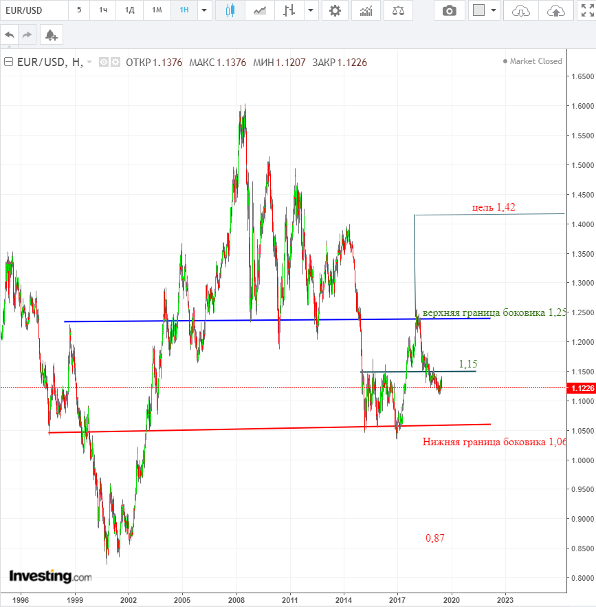 C 2005 по 2014 у нас была сформирована разворотная формация с нижней границей 1,25 по споту. С 2015 мы падали до 1,05 и сделали консолидацию с границами 1,15 -1,05 по 2017 год. И только в 2018 попробовали 1,25 - нижнюю границу консолидации 2014 года. Исходя из нынешнего положения дел, выходит, что мы должны попробовать нижнюю границу консолидации 2017 года - 1,06. Получается, что сейчас открывать позиции по паре ED - нет смысла, нужно подождать экстремумов, а именно 1,06 по споту. Сам я ожидаю пару выше и цель теперь по споту - 1,42. Сейчас остается шанс для лонга, при возвращении цен выше 1,15 по споту и только там искать точки для входа в лонг. А так вынужден разочаровать - движение в валютах переносится на 2021-2022 гг.