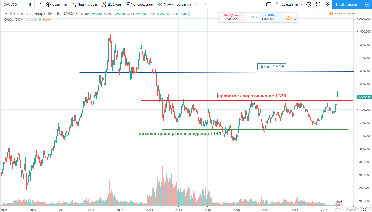 У нас была консолидация с 2013 по 2019 гг с границами 1145-1370. В этом году вышли из консолидации вверх с целью 1596 по споту. Если мы считаем, что золото должно пойти на юга, то мы должны понимать, что этот вынос был ложным пробоем. Поэтому воспользуемся правилами определения "медвежьей или бычьей западни":