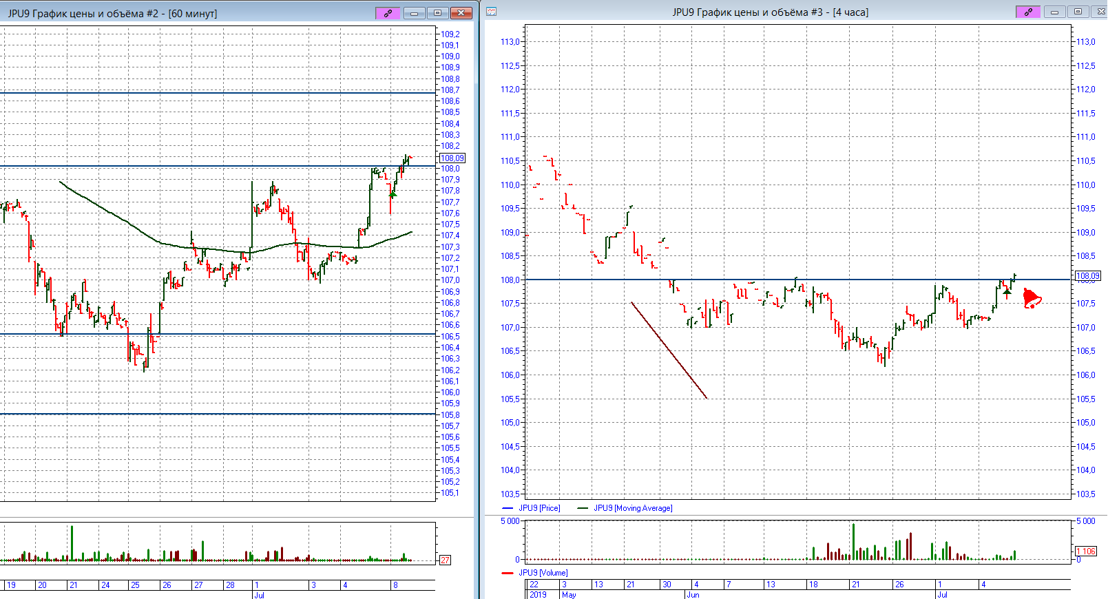 UJPY-9.19. По этому инструменту давно не открывал позиции. В принципе идею подсмотрел у Алексея, по моему в каком то из его блогов увидел вчера картинку с разворотной фигурой по японскому индексу. Вход получился не очень хорошим, но пробуем: