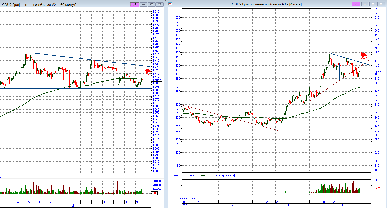 Из идей - буду пробовать шорт GOLD-9.19 от верхней границы консолидации на Н1, разумеется не прямо от границы (район 1425), а вход по стопу на М5 при действительном отскоке от сопротивления, с целями пока 1370: