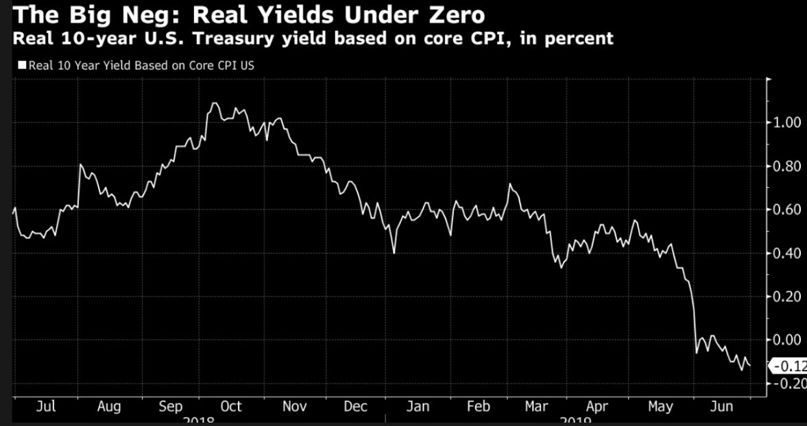 С конца июня реальная доходность 10-летнего казначейства США с учётом базового индекса потребительских цен является отрицательной.