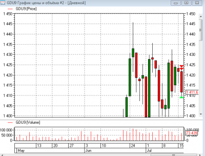 Вот и цена 1400. Вчера днём зашортил золото двумя заходами со средней ценой 1423 по нашему ближайшему фьючу. Половину закрыл на вечерней сессии на 1409,6. Половину оставил на сегодня. Посмотрим за уровнем, если что закрою. Отскакивать пока не спешит. Возможно уйдёт под 1400 к 1395.