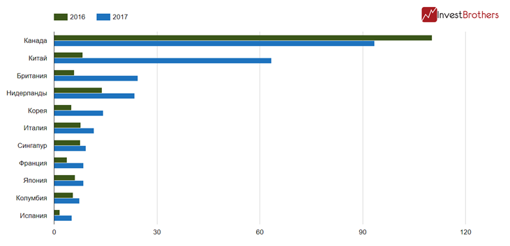 На первом месте по импорту из США, по-прежнему находится Канада, правда ее покупки снизились за этот год: с 110,2 млн в 2016 г., до 93,5 млн в 2017 г.