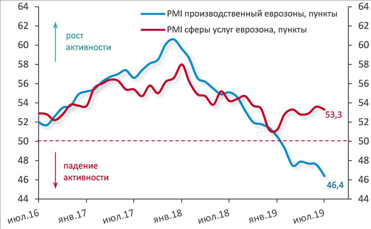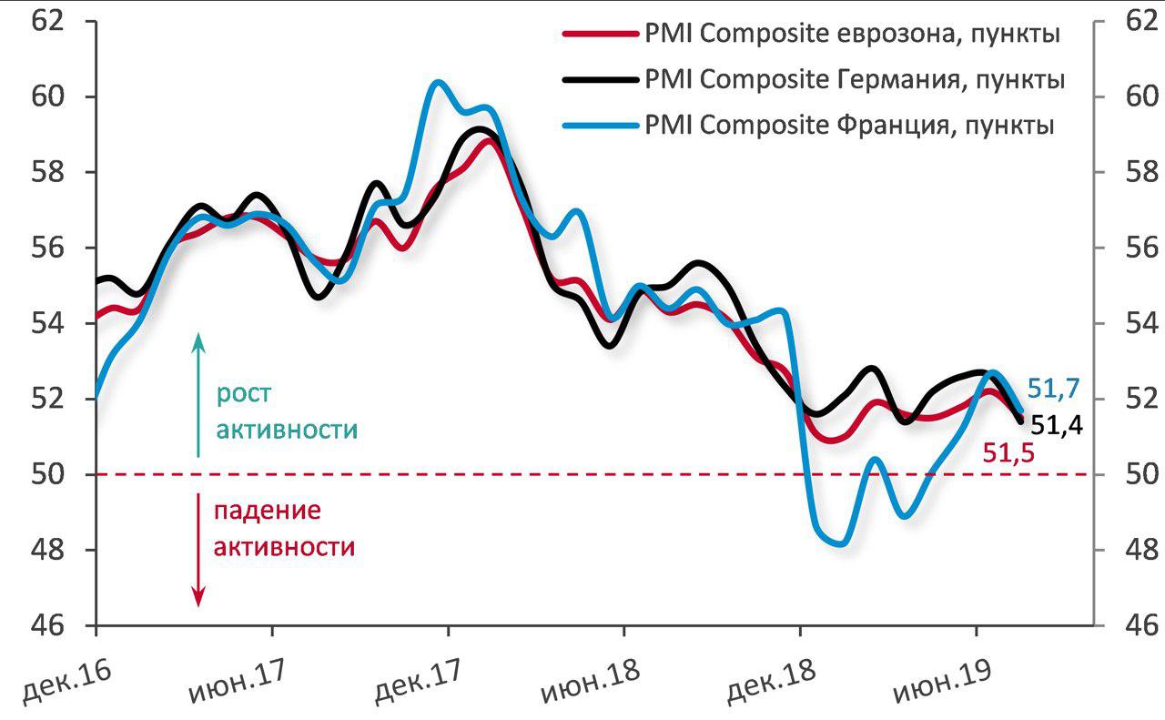 Деловая активность в производственном секторе снижается во всем мире. Во Франции в этом секторе Франции индекс PMI сократился с 51,9 п. в июне до 50 п. в июле. PMI сферы услуг снизился с 52,9 п. до 52,2 п., композитный индекс деловой активности упал до 51,7 п.
