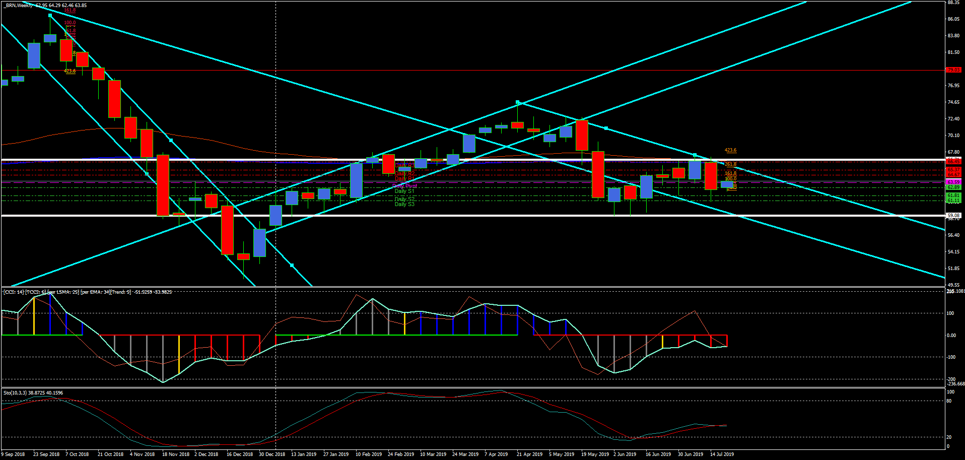 Например, рассмотрим нефть. Нефтяные цены имеют четкие тренды, которые длятся примерно по полгода. И пока идет очередной тренд в нефти, любые события, новости или высказывания, влияют на нефтяные цены очень кратковременно. Сейчас цены на нефть снижаются из-за банального ее перепроизводства. Но по прогнозам, ближе к концу года спрос вырастет и нефтяной баланс будет выравниваться. Последние события с танкерами в Персидском заливе, жесткая риторика со стороны западных стран на эти инциденты, сбитые дроны с обеих сторон – не смогло сильно повысить нефтяные цены, а причина проста: в нефти идет снижающийся тренд, который начался еще в конце апреля с уровня 75.50.