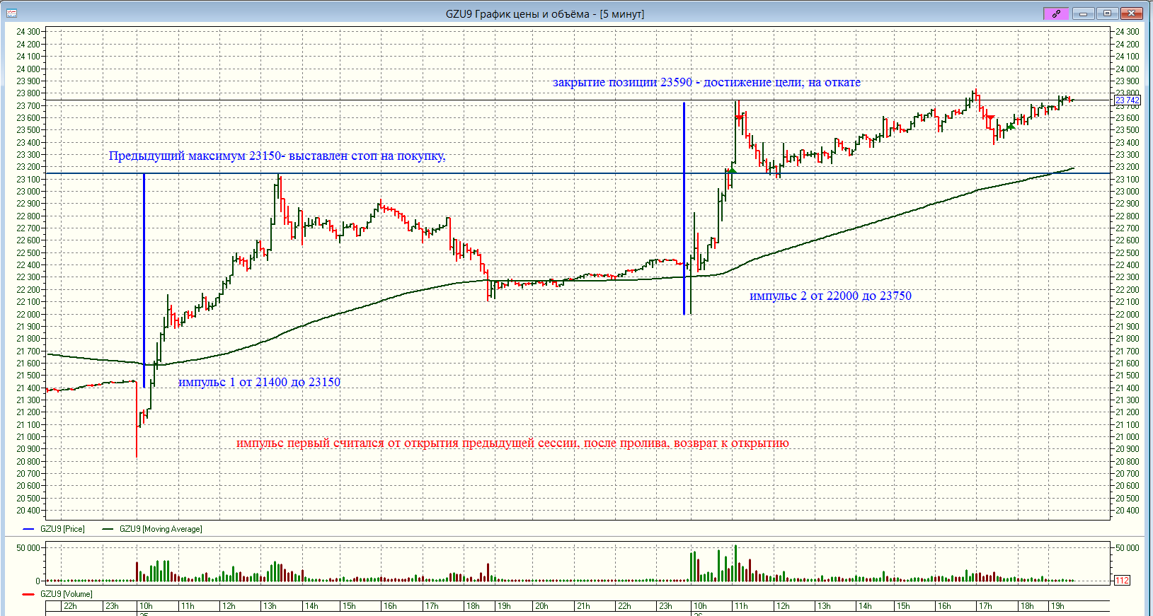 Не все коту масленица конечно. Все-таки своеобразное правило Линды, описанное в прошлом посте. Нужно, нужно держать позиции, приносящие прибыль и на корню резать убытки. Сегодня вот в лонг газика уже побоялся встать, а он снова вырос (правда получилось поинтрадеить - ниже график покажу, интересная интрадей сделка получилось). Ну, что я могу поделать, я такой же как и многие. Нам все кажется, что бумаги которые падают вот-вот отскочат, а которые растут - вот-вот упадут...