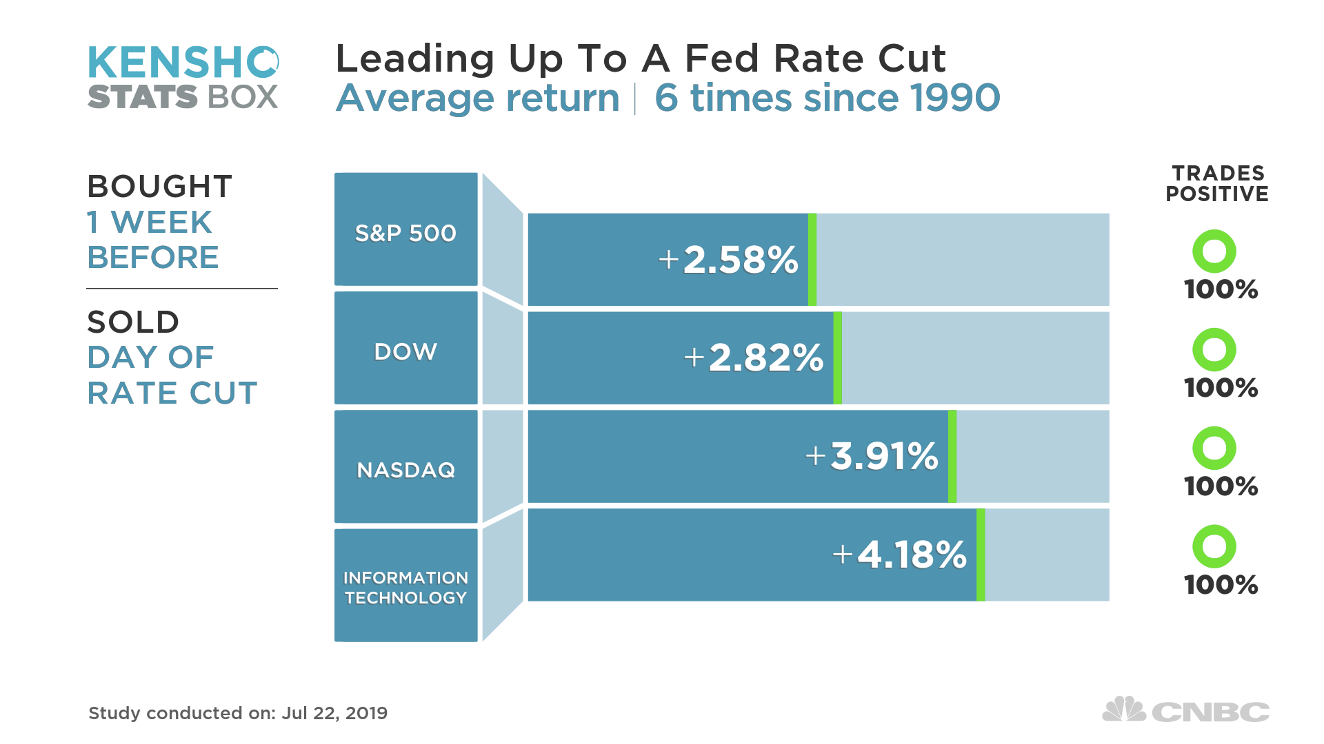 Но история рынка говорит, что любое снижение ставки воспринимается рынком как бычьий сигнал для акций в дни перед заседанием FOMC. Это основано на анализе CNBC данных от Kensho, аналитической платформы, используемой банками Уолл-стрит и хедж-фондами для определения моделей торговли. В последние три десятилетия временной промежуток в несколько дней (точнее около недели) непосредственно перед сокращением ставки ФРС было позитивным для основных фондовых индексов.
