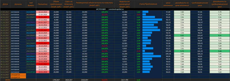 Полный список размещений ОФЗ за 2017 г., с учетом результатов последнего аукциона от 13.12.2017