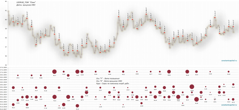 График размещений ОФЗ (по параметрам — дата погашения; спрос при размещение) в соотношение с графиком #USDRUB за 2017 г.