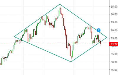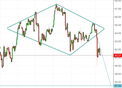 А если посмотреть на график нефти 4h, то можно увидеть фигуру «бриллиант». Полная отработка может привести к цене ~57.5.