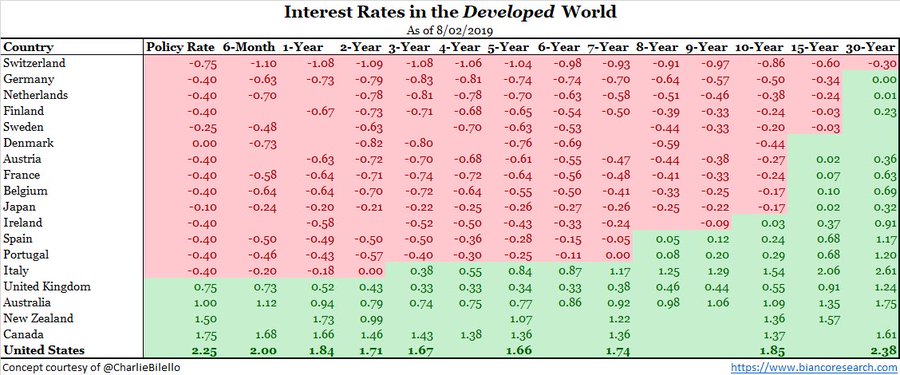 Процентные ставки развитых стран Здесь вы увидите процентные ставки развитых стран на одной картинке. Оцените сколько на ней красного, которым отмечены отрицательные ставки: Интересно что самые большие они в Штатах и именно их экономика чувствует себя лучше других. экономика 05.08.19 21:30 15923 Ostap +11 1 комментарий artem.direktor 06.08.19 16:16 # ↓ А в России 7.25 И как вы себя чувствуете, лучше чем в штатах?