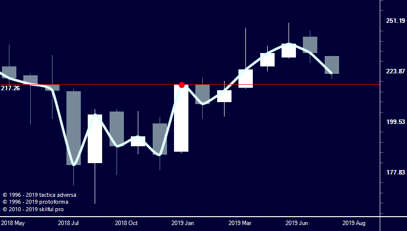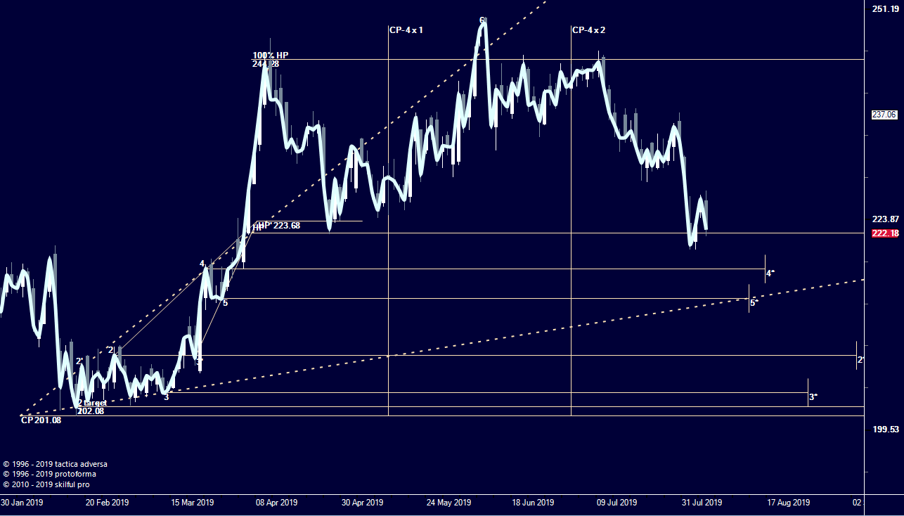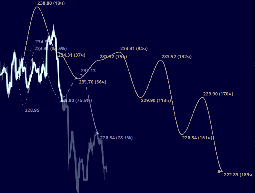 однако можно и сейчас рассмотреть вопрос что делать. Покупки рассматриваю выше 227. По продажам внизу выступает сопротивлением уровень т.4 МР (модели расширения) модели месячного плана (подробней о свойствах этого уровня в материалах Школы искусств на нашем сайте):