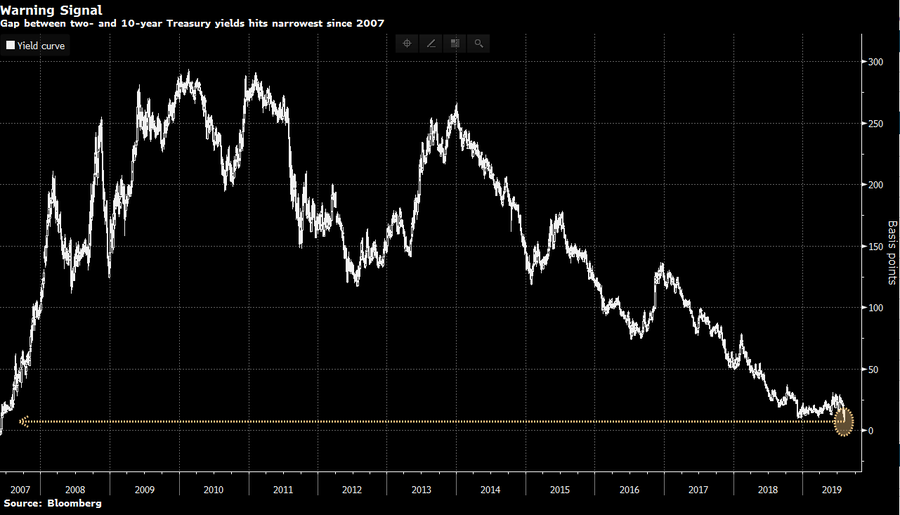 Спред между двух и десятилетними доходностями государственных облигаций считается одним из наиболее точных индикаторов проблем в экономике. Сейчас этот спред вернулся на уровни 2007 года и вчера снова обновил свои лои, что является очень нехорошим признаком для экономики, а как следствие и для фондовых рынков:
