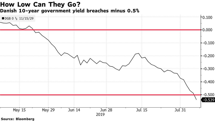 При этом падение доходностей облигаций по миру продолжается, так например, доходность Датских десятилеток упала в августе ниже нуля и ушла на -0,5%: