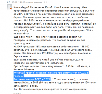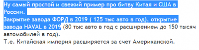 Еще раз постараюсь другими словами донести до ВАС следующее. Как правило, себестоимость одного и того товара в Китае ниже, чем в США. Американцы закрывают в РФ продажи и уходят (Opel, GM, Ford), а китайцы открывают заводы. Тоже происходит не только в РФ, но и в мире. Про Хуавей вы и сами согласились. Эта компания очень большой звоночек для США. На ее примере видно, что США боится технологического конкурента и давит его всеми силами.