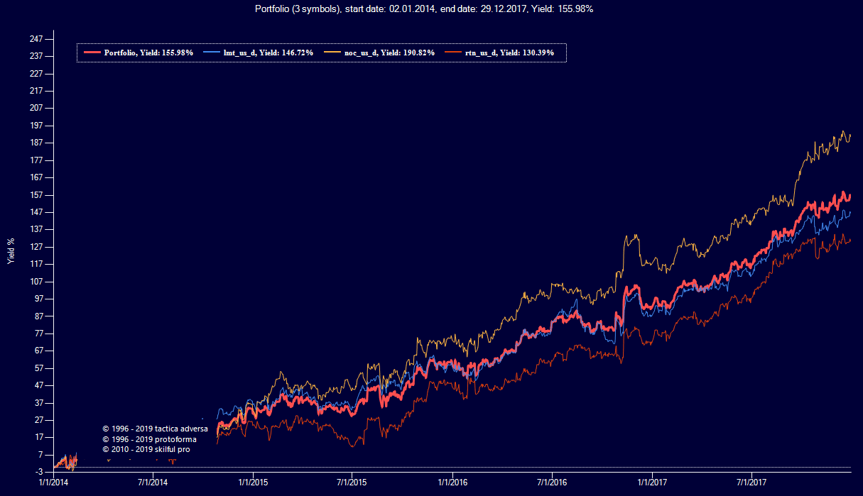 Достаточно рассмотреть рост акций трёх компании из сектора ВПК США после событий 2014 года (Крым, Украина… пропаганда, истерия, лоббирование интересов и новые, как бюджетные, так и внешние заказы посыпались как из рога изобилия.