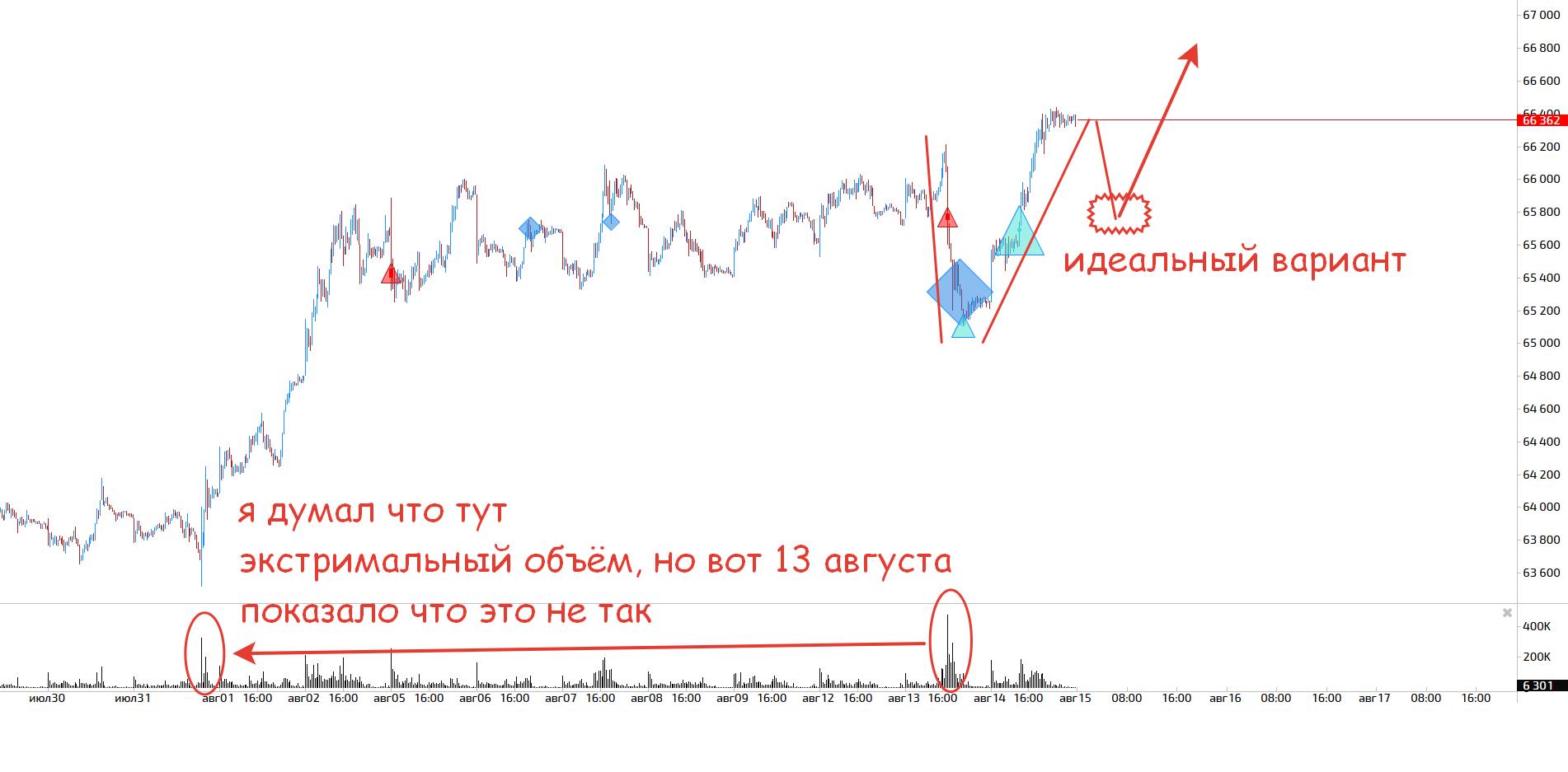 Пока всё смотрит по прежнему вверх, объём толкает цену выше, с учетом такого сильного ухода под уровень и захвата ликвидности, движение вверх можно сильно разогнаться!