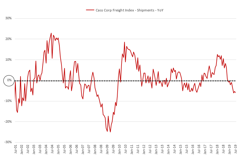 В то время как многие заявляются что в экономике США всё хорошо в отличие от экономик китайской и европейской, например. Ежемесячный индекс грузоперевозок Cass Corp показывает, что в июле поставки упали на 5,9% г/г и это 8-е снижение подряд.