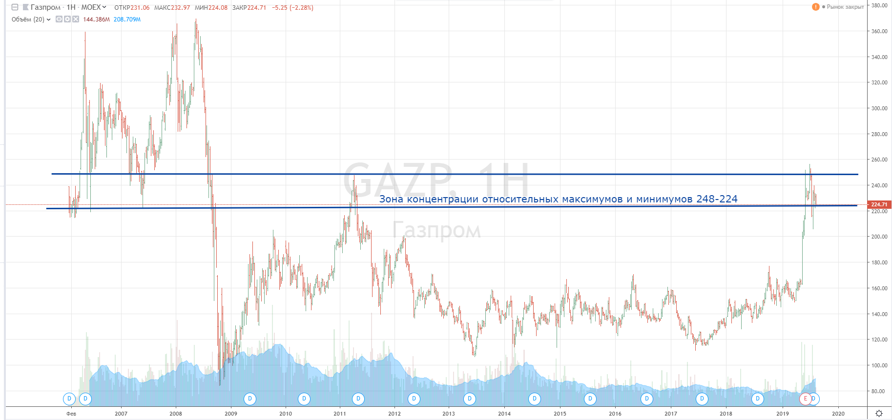 Здесь все просто, еще месяц нахождения в зоне 224-248 и мы получим очень бычий сигнал с целями 340-360.