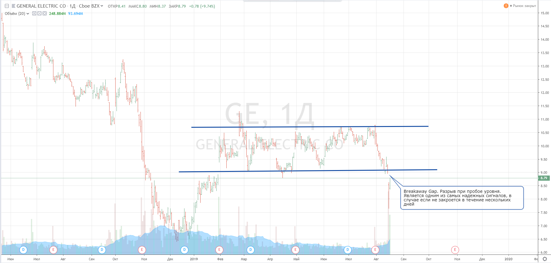 Различают несколько видов Gaps. Один из них явно в GE. Если его в течение недели не закроют, то скорее всего я с этим инструментом попал. А если вернемся снова в середину диапазона, то мы получим очень бычий сигнал в нужную сторону.