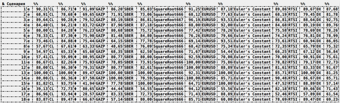 "на основе моделей ТА на е, Φ, нефть (CL), GAZP, SBER, корень из 666, EURUSD, постоянная Эйлера, РТС, индекс доллара (DX) и сравним вероятности отработки Сценариев (в примере 18 различных сценариев) между собой", исследования другого нашего коллеги: