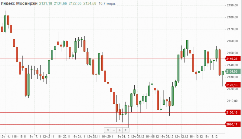 Индекс Мосбиржи на прошедшей торговой сессии закрылся на отметке 2134,58п. продемонстрировав снижение на 0,44%. В текущей ситуации ближайшая поддержка расположена на отметке 2123п. и основная 2100п-2090п. Локальным сопротивлением выступает 2145п. и основным 2165п.