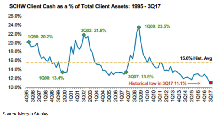 Как передает агентство Bloomberg, по данным инвестиционного банка Morgan Stanley, на отдельных индивидуальных брокерских счетах осталось достаточно мало денег. Данное заявления подтверждает и Charles Schwab Corp. Сумма денежных средств их клиентов в процентах от активов снизилась до 11%, что является самым низким показателем с 1995 г.
