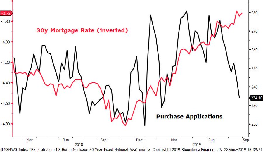 Интересно, что ипотечные ставки при этом снижаются, что в нормальной ситуации подразумевало бы обратный результат.