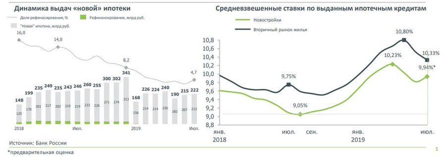 За 7 мес. 2019 г. выдано 675,8 тыс. ипотечных кредитов (-13,9% к 7 мес. 2018 г.) на 1,49 трлн руб. (-4,5%)
