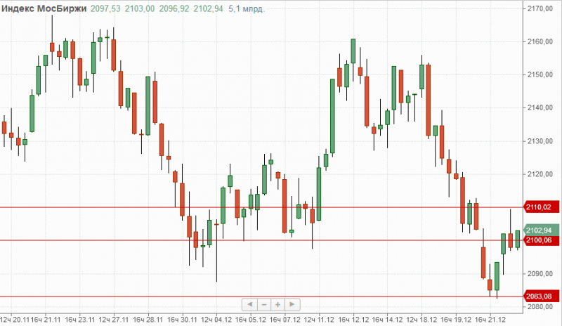 Индекс Мосбиржи в пятницу закрылся на отметке 2102,94п. прибавив 0,46%. В текущей ситуации поддержки расположены на уровне 2100п-2083п. Локальным сопротивлением выступает отметка 2110п. закрепление над которой даст шанс индикатору на восстановление роста.