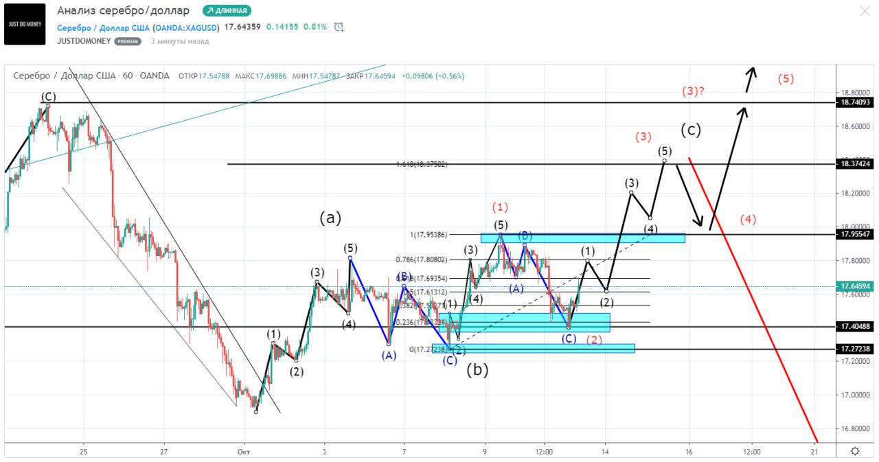 Серебро завершило коррекционную модель зигзаг (волна 2) и начинает восходящую тройку ориентировочные цели обозначены на графике. Открытый вопрос: 1) формируется коррекция от снижения 4 или 24 сентября (в этом случае коррекция может быть от обоих движений и влияет на то каких размеров будет коррекция), 2) Возможно это начало восходящего импульса, в этом случае цена уйдет выше максимумов 4 сентября. Кто не в позициях лучший сценарий покупать на откате, коррекции. А учитывая фундаментальную сторону - переговоры США и Китая, где большая не определенность для многих было бы актуально сидеть на заборе. Сегодня или в понедельник будет ясно, как завершатся переговоры и как отреагирует рынок.