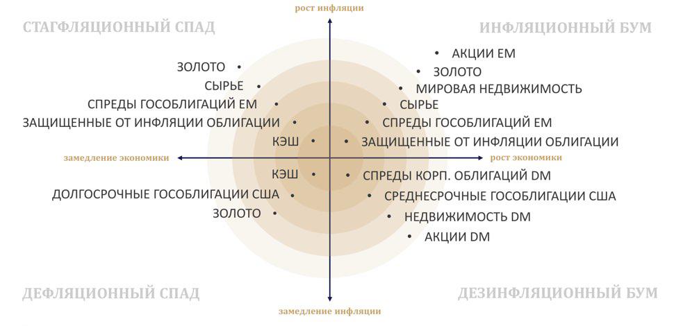 «Все гениальное просто...» (к автору цитаты можно относиться по-разному, но слова верные). Десятилетие рефляционной политики ведущих центробанков в ответ на болезненный процесс делевериджа, взявшего начало после кризиса 2008 в развитых странах, отправил мировую экономику в квадрант «безинфляционного бума» (период восстановительного, но слабого роста экономики в условиях постоянной дефляционной угрозы).