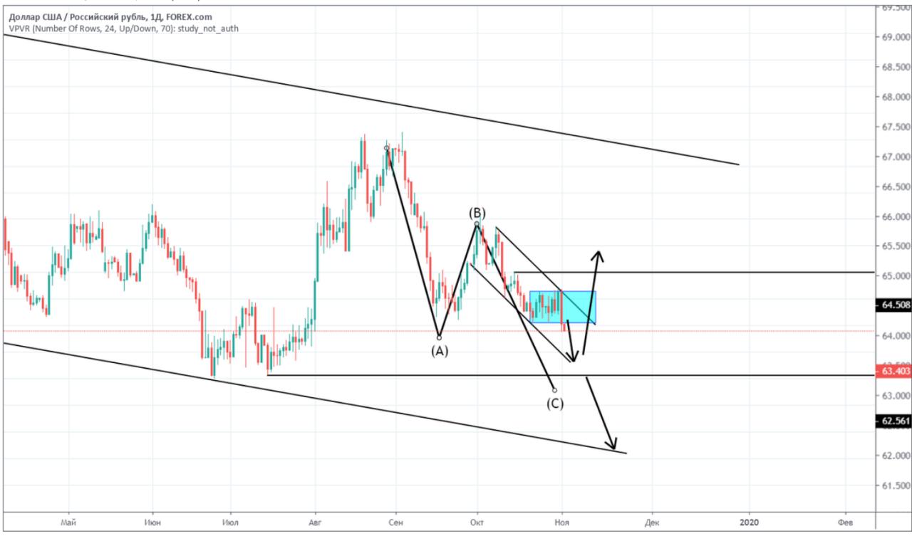 Рубль. По рублю также идет завершающий импульс вниз после которого ожидаю сильный рост доллара. Буду ловить сигнал.