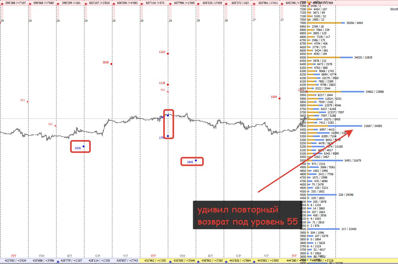 Импульс случившийся в пятницу, всё-таки оправдал мои бычьи ожидания, прошлой недели, хотя тут конечно всё получилось совсем не так, как мне этого хотелось, всю прошлую неделю торговал нефтью с убытками, поскольку покупал и стопился, а тот импульс что мы увидели в пятницу, я уже не смог чисто технически для себя отработать. Объёмы, которые набирались неделей ранее, проявили себя не на тех уровнях, на которых я их ожидал. заход под уровень 55 назад, не предполагался: