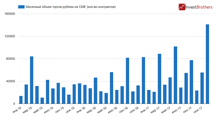 Предыдущий рекорд по объему торгов был установлен в июне 2017 г ., когда месячный оборот составил почти 101,9 тыс. контрактов. Напомним, что июнь стал одним из самых слабых месяцев для российского рубля в 2017 г.