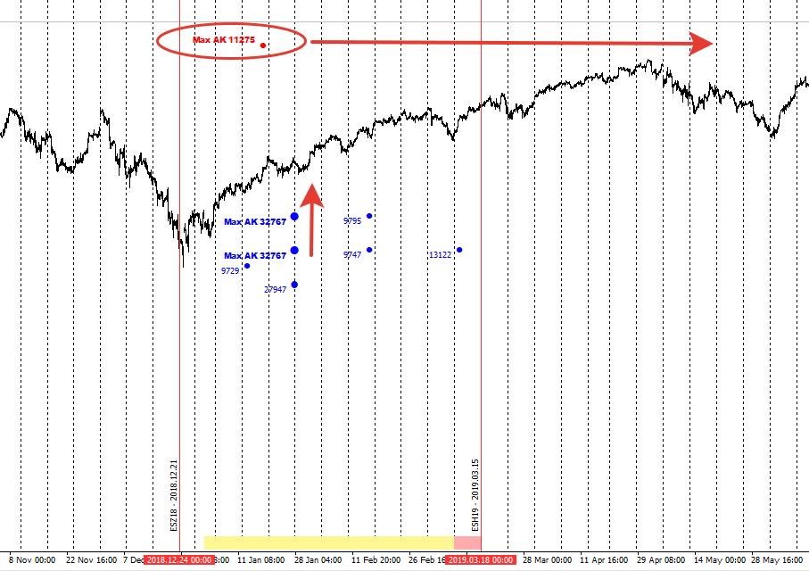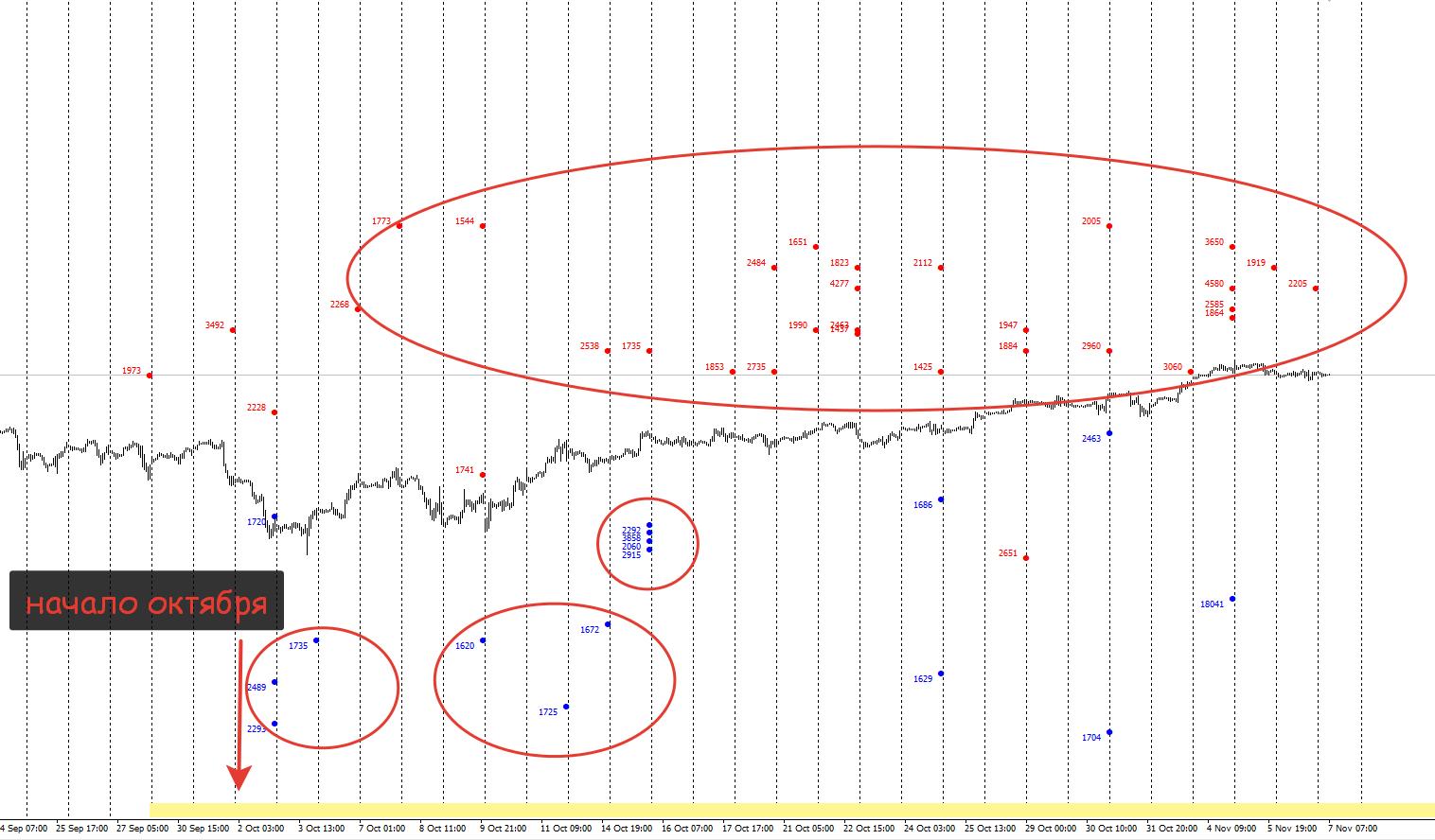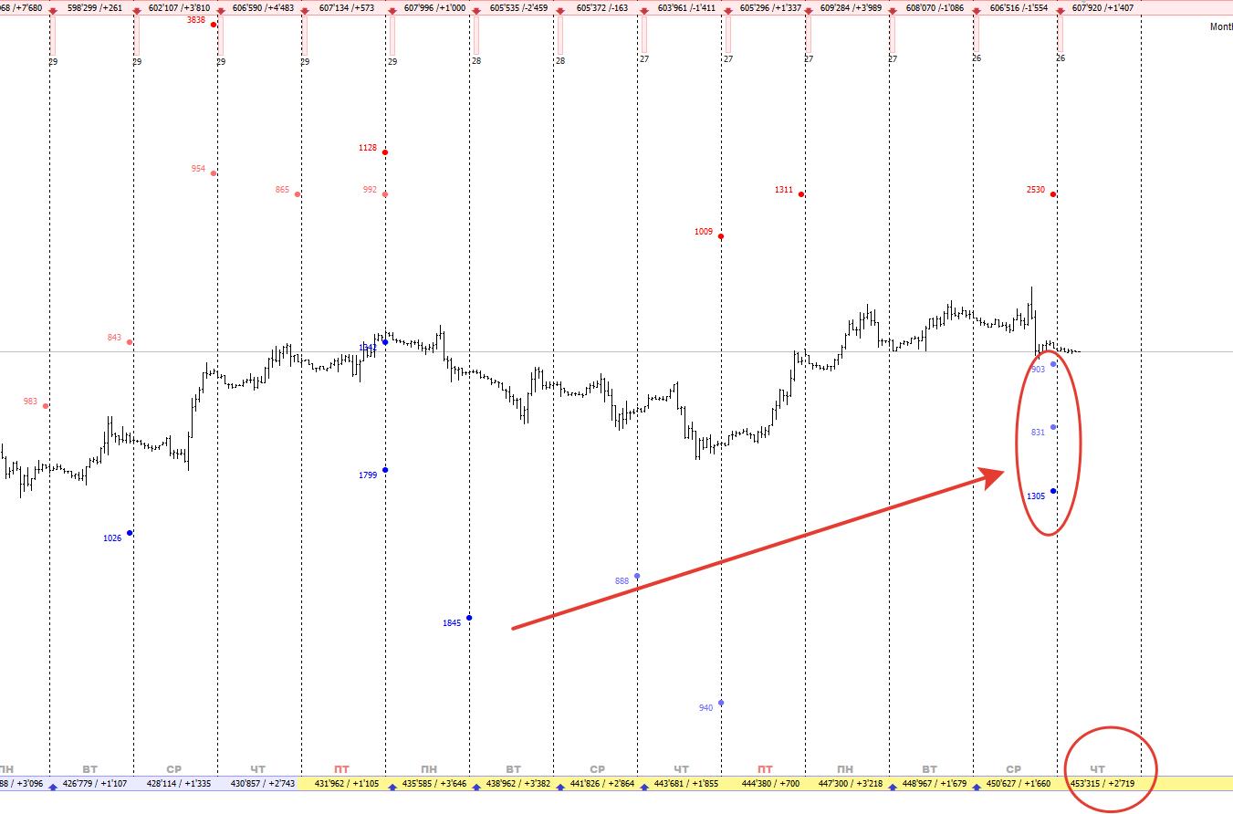 Ну и также издалека давайте посмотрим только на самые крупные объёмы, которые появляются в рынке, они на текущий момент только от покупателя, но мы подобно прошлым контрактам скорее всего в ближайшее время совершим попытку сходить на коррекцию к ним, а они уже находятся довольно глубоко, на уровнях около 2600, отрыв от них уже очень существенен, поэтому учитывая фактор набора локальных продаж, именно они могут стать драйвером глубокой коррекции на отметки ниже 2700: