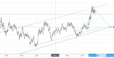 По серебру формируется потенциальный коррекционный канал. Круг соответствует возможной точке входа, которая коррелирует с точкой входа по золоту.