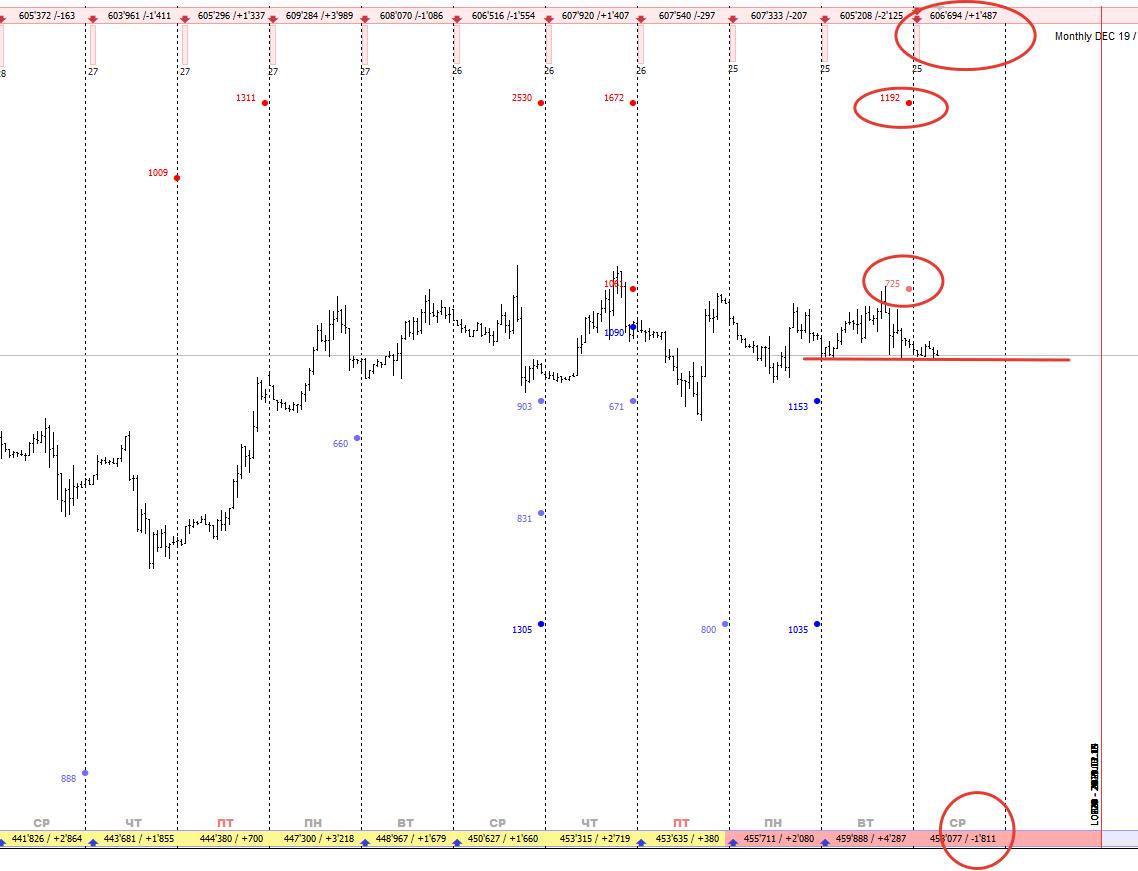 Сегодня в преддверии экспирации нефть показывает сигнал на продажу, который отлично сочетается с тем, что вчера мы видели ложный пробой наверх и усиление продаж после этого! По прежнему вероятность остаться выше 55 по легкой нефти до пятницы высока, но отказываться от продаж хотя бы внутри дня не вижу смысла.