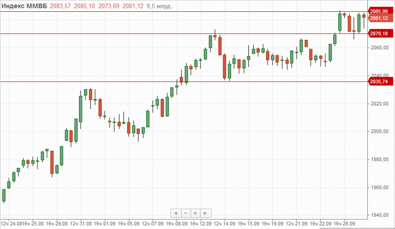Индекс ММВБ на торгах в среду закрылся выше отметки 2075п., сформировав очередной мини диапазон 2065п.-2085п. При продолжении позитивной динамики цели роста расположены на отметках 2110п.-2150п., проход же отметки 2060п. активирует продажи.