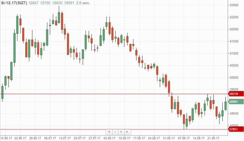 Фьючерс $/руб. торговую сессию среды провел в рамках озвученного ранее диапазона 57850п.-59300п., выход из которого ожидается порядка 1000п. по направлению движения.