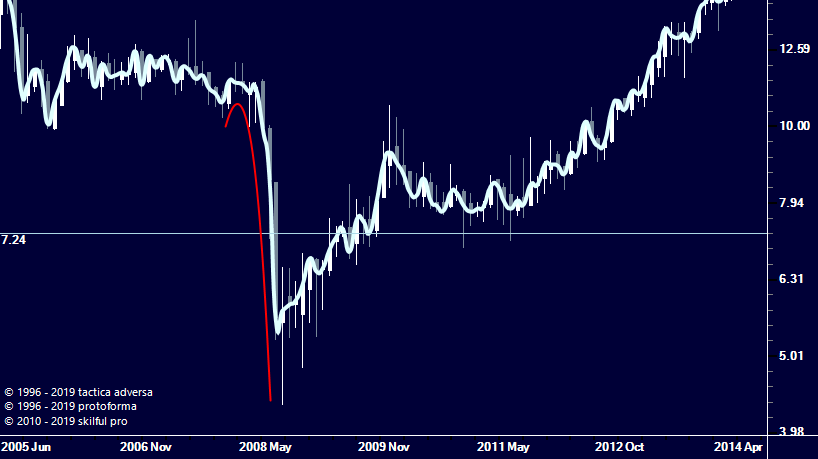 Кризис 2008 года, падение по параболе на ~60%, откат к уровню (рассчитывается автоматически в программе) пробой и затем дальнейший рост (месячный план):